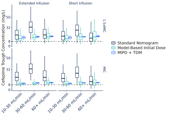 Clinical studies are still necessary to better understand the optimal exposure targets for cefepime. Targeting 1.5× MIC (e.g., 12 mg/L for an MIC of 8 mg/L) provided the best balance in our simulations, after accounting for patient variability; aiming directly at 8 mg/L lead to a greater percentage of patients undershooting the target. Targeting 4× MIC approximately doubled doses relative to standard nomograms, which seemed clinically unreasonable. As MIPD for cefepime scales up, it’s expected that we'll learn more about the right targets.