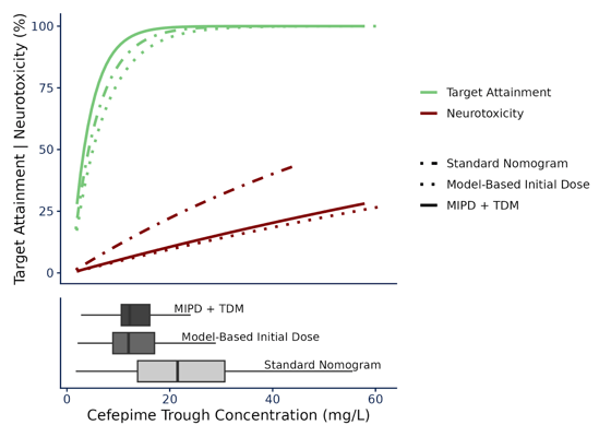Figure 2. Pharmacodynamic endpoints of target attainment (fT>MIC > 95%) and neurotoxicity risk as approximated by a 0.50 multiplier (likely underpredicting) on the Boschung-Pasquier model over cefepime trough concentration and grouped by dosing approach when targeting 1.5xMIC. The fit curves are structured Percent = 100 × (1−e−k⋅Cmin,ss) with k estimated by endpoint and dosing approach with an asymptote at 100%.